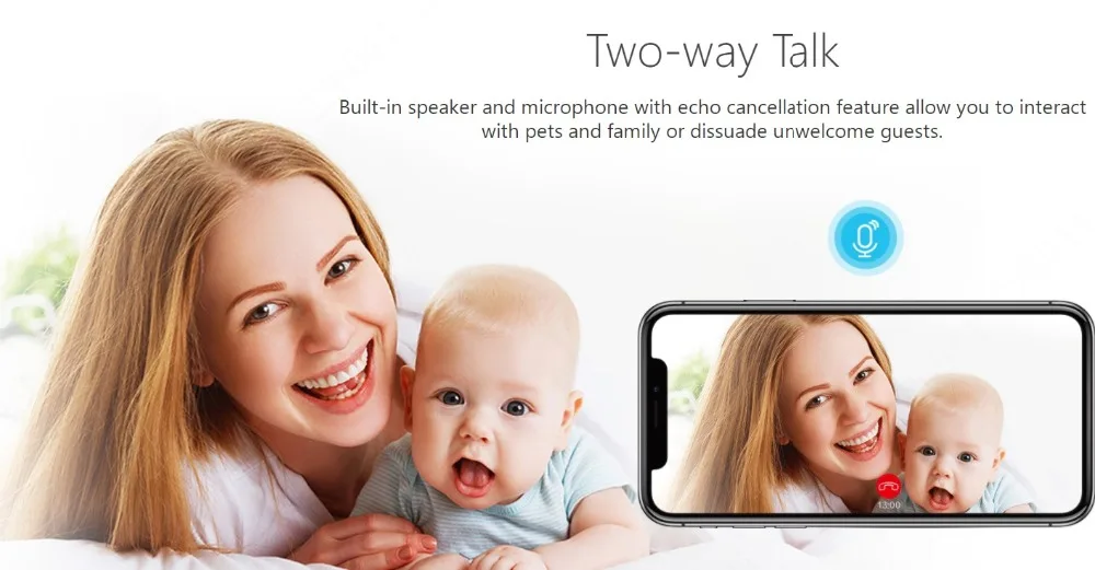 Вбудований динамік і мікрофон дозволяють взаємодіяти з домашніми тваринами та родиною або відмовляти небажаних гостей.