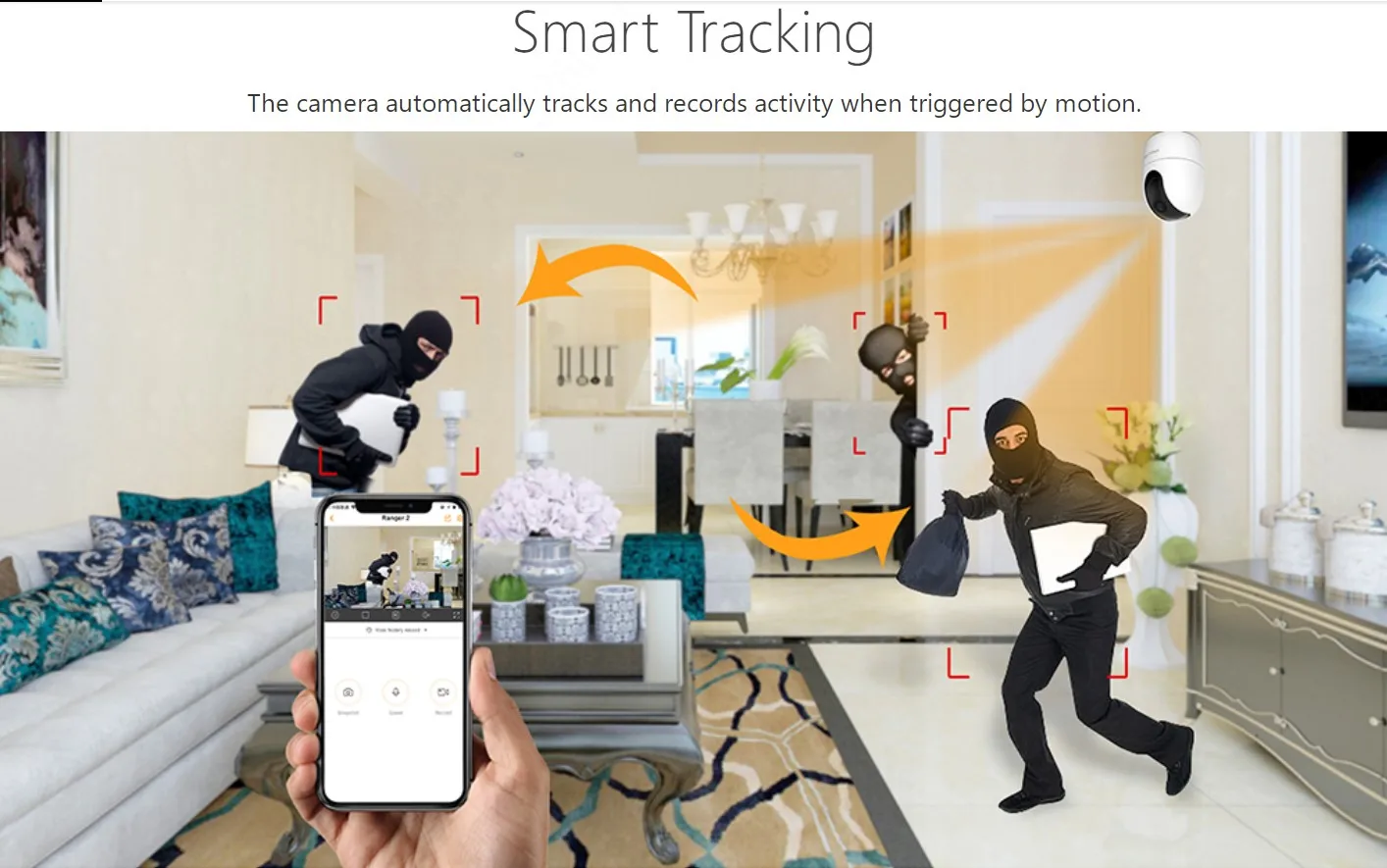 Панорамування і нахил рейнджер з додатком на вашому смартфоні, щоб переглянути кожен куточок вашого будинку. З роздільною здатністю 1080P Full HD live і 0 ~ 355 ° панорамування і-5 ~ 80 ° Нахил створює повне покриття, не залишаючи сліпих плям.