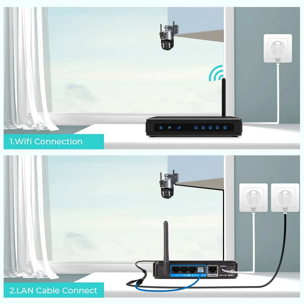 У разі живлення від адаптера DC12V ви можете під'єднати камеру до мережі Wi-Fi. ви можете налаштувати Wi-Fi-з'єднання камери або пошук через локальну мережу з мережевим кабелем, під'єднаним до маршрутизатора, працювати тільки з Wi-Fi 2,4G (не підтримує 5G).
