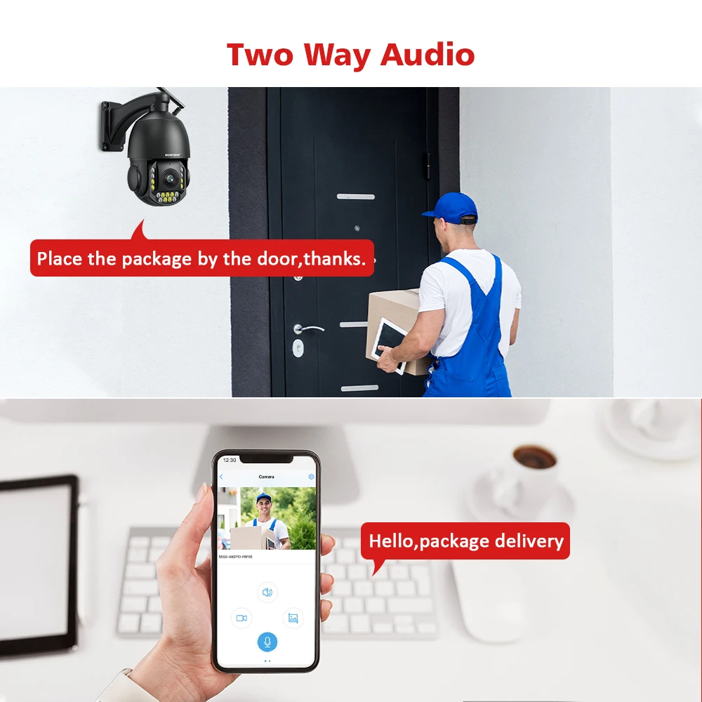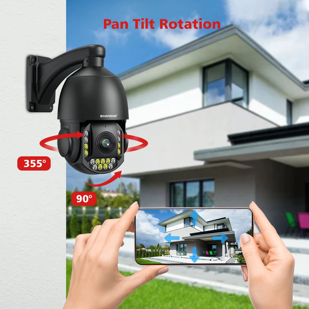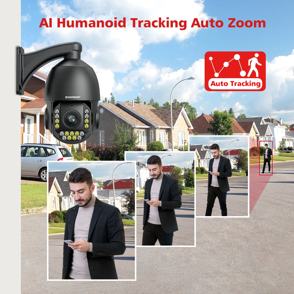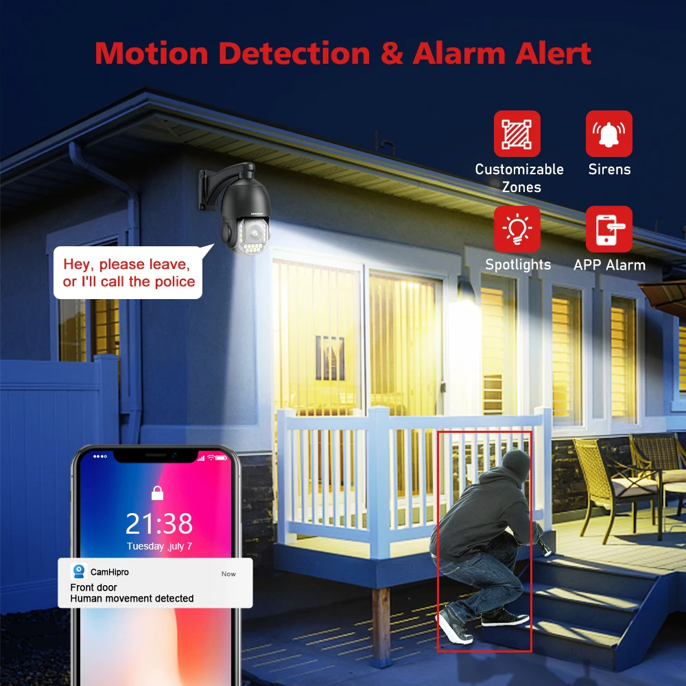Камера автоматично регулює поворот/нахил і масштабування, захоплюючи чіткі цілі моніторингу й автоматично відстежуючи людини, що рухається, а також надсилаючи сповіщення електронною поштою або повідомленнями на ваш телефон.