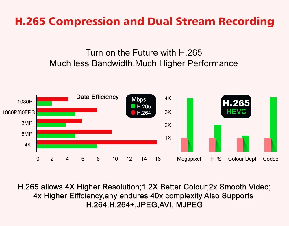 Прийняття розширеного стиснення відео H.265 неабияк підвищує ефективність використання смуги пропускання та швидкість передавання.