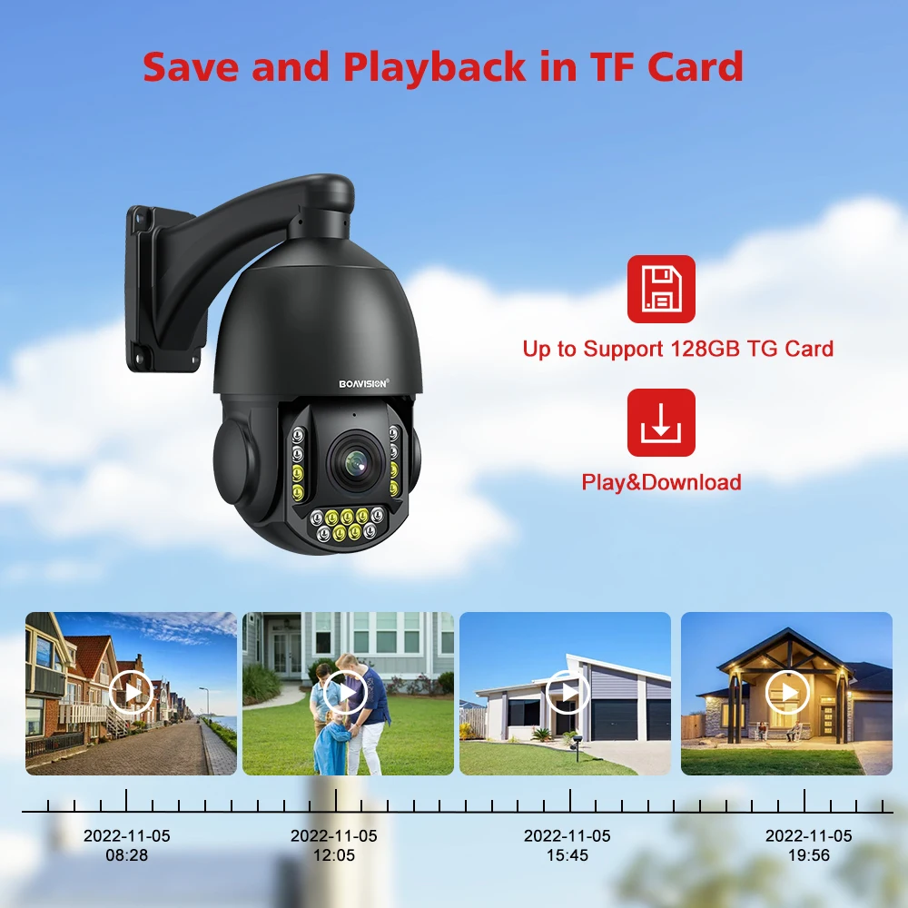 Вставте micro SD-карту й автоматично зберігайте відео на карту, шукайте та переглядайте відтворення відео через застосунок для телефона в будь-який час у будь-якому місці.