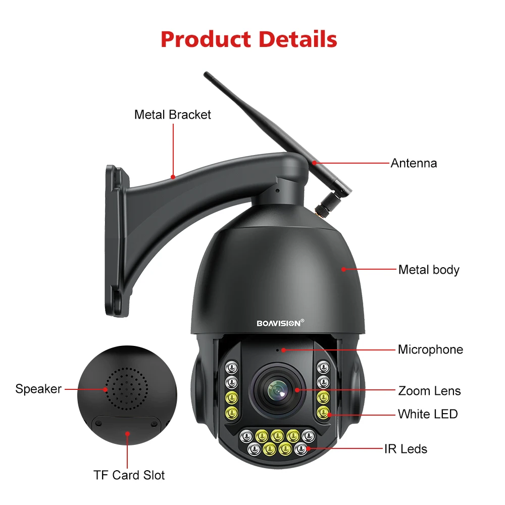 Підтримка голосового сповіщення, сповіщення електронною поштою, FTP-споживлення, з функціями виявлення руху, сповіщення в реальному часі вирушатимуть на ваш телефон, щоб уникнути втрати майна. Или установите зони виявлення руху, щоб зосередитися на важливих зонах, як-от двері або вікна, ви отримуватимете сповіщення про рух тільки тоді, коли там щось відбувається.
